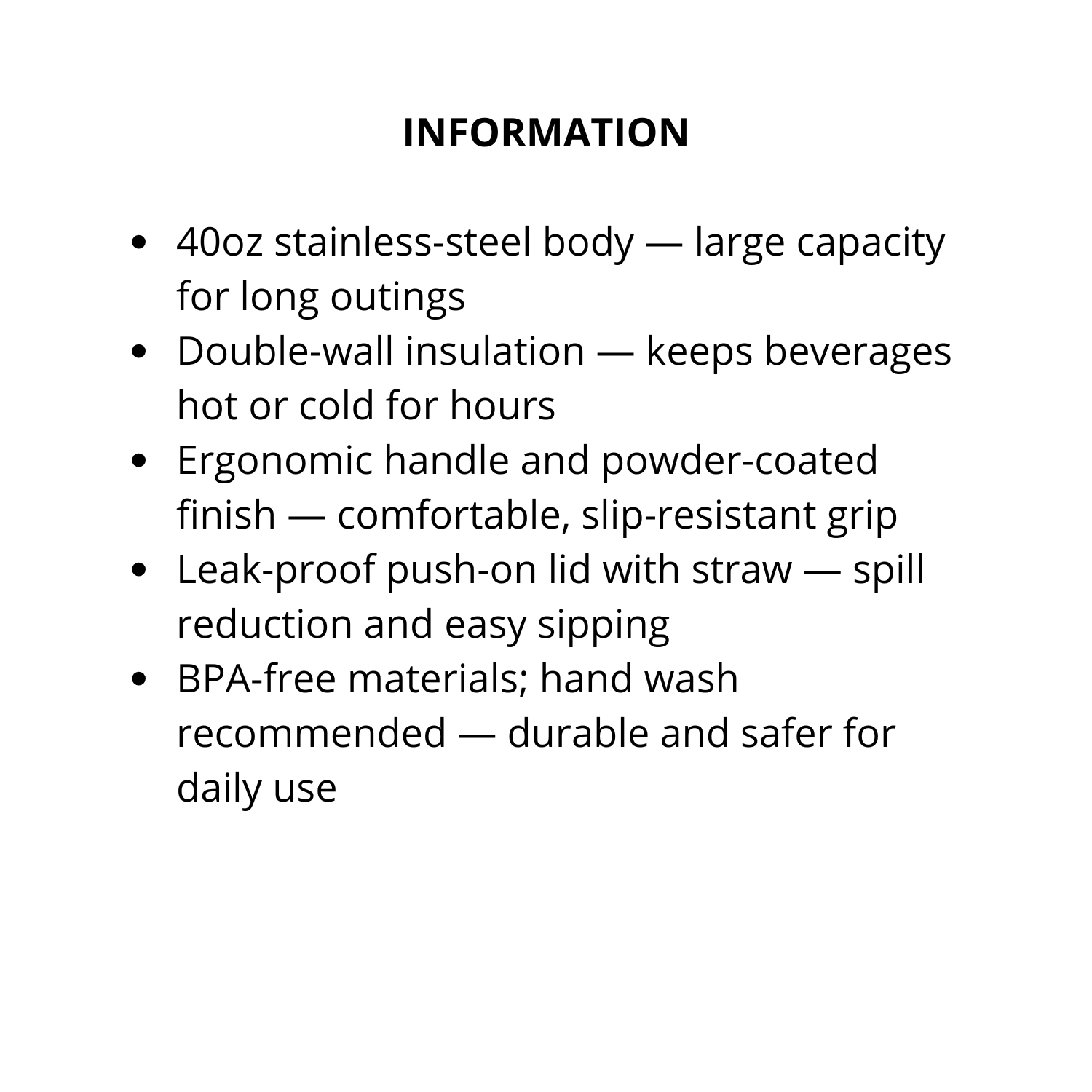 - Double-wall insulation — keeps beverages hot or cold for hours