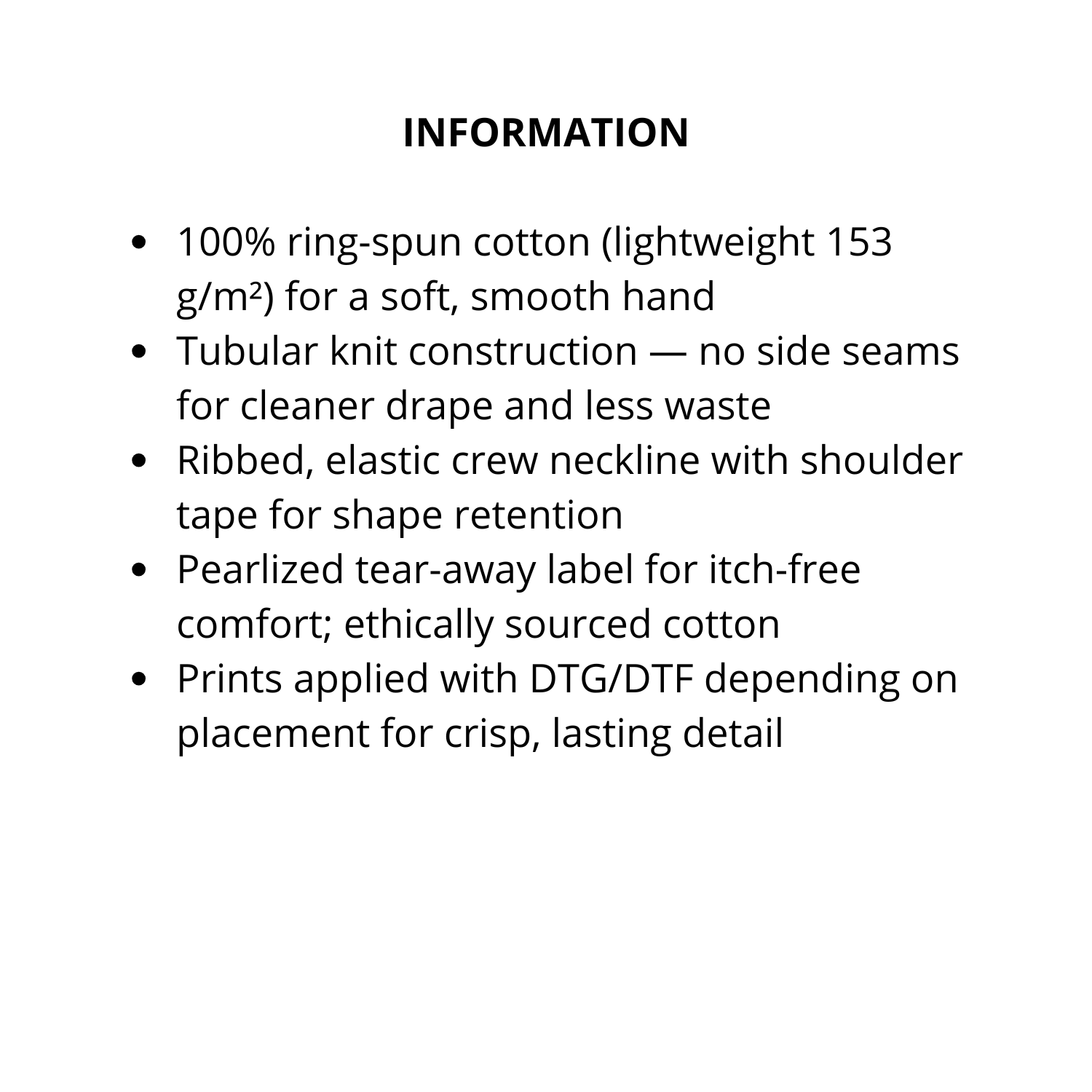 - 100% ring-spun cotton (lightweight 153 g/m²) for a soft, smooth hand