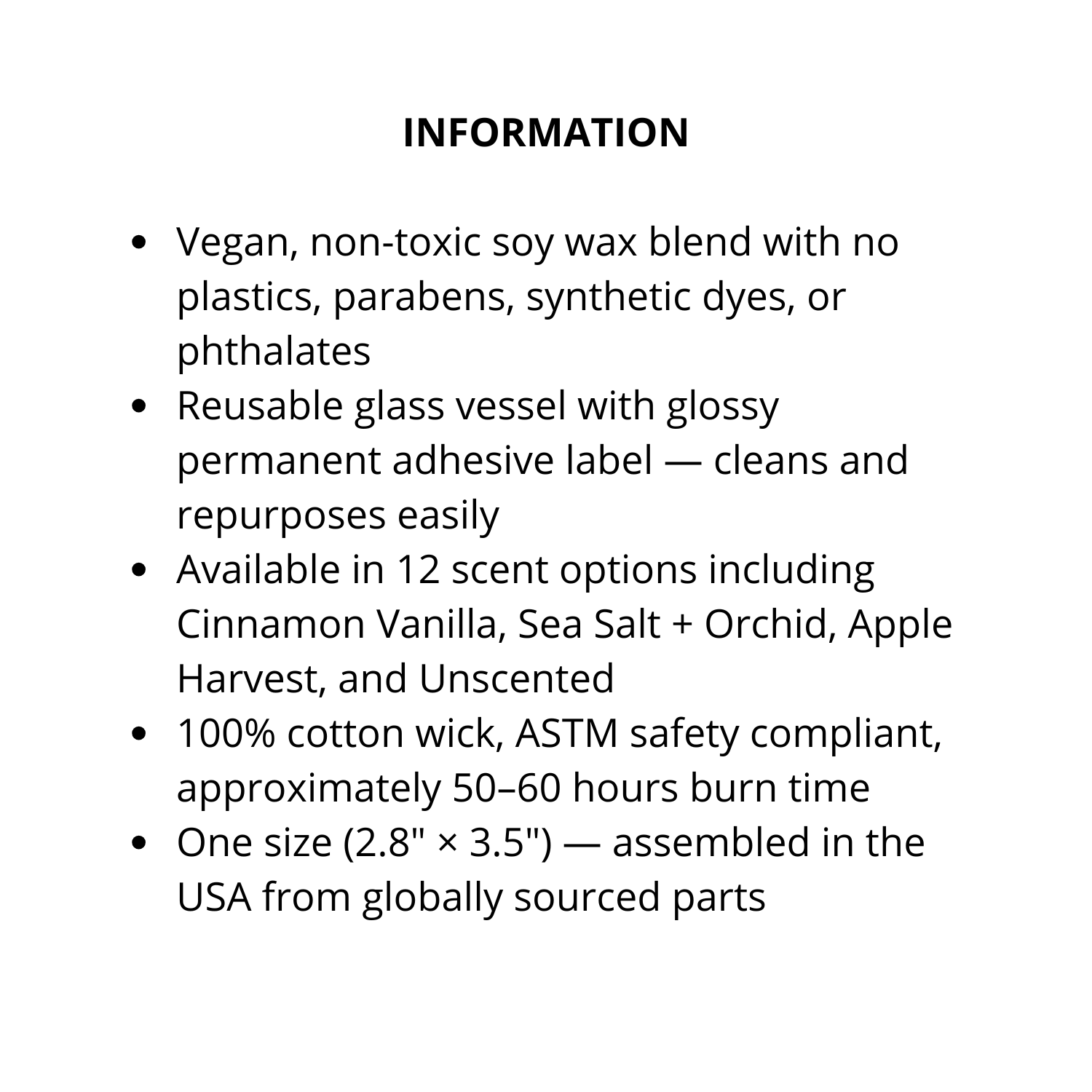 - Available in 12 scent options including Cinnamon Vanilla, Sea Salt + Orchid, Apple Harvest, and Unscented