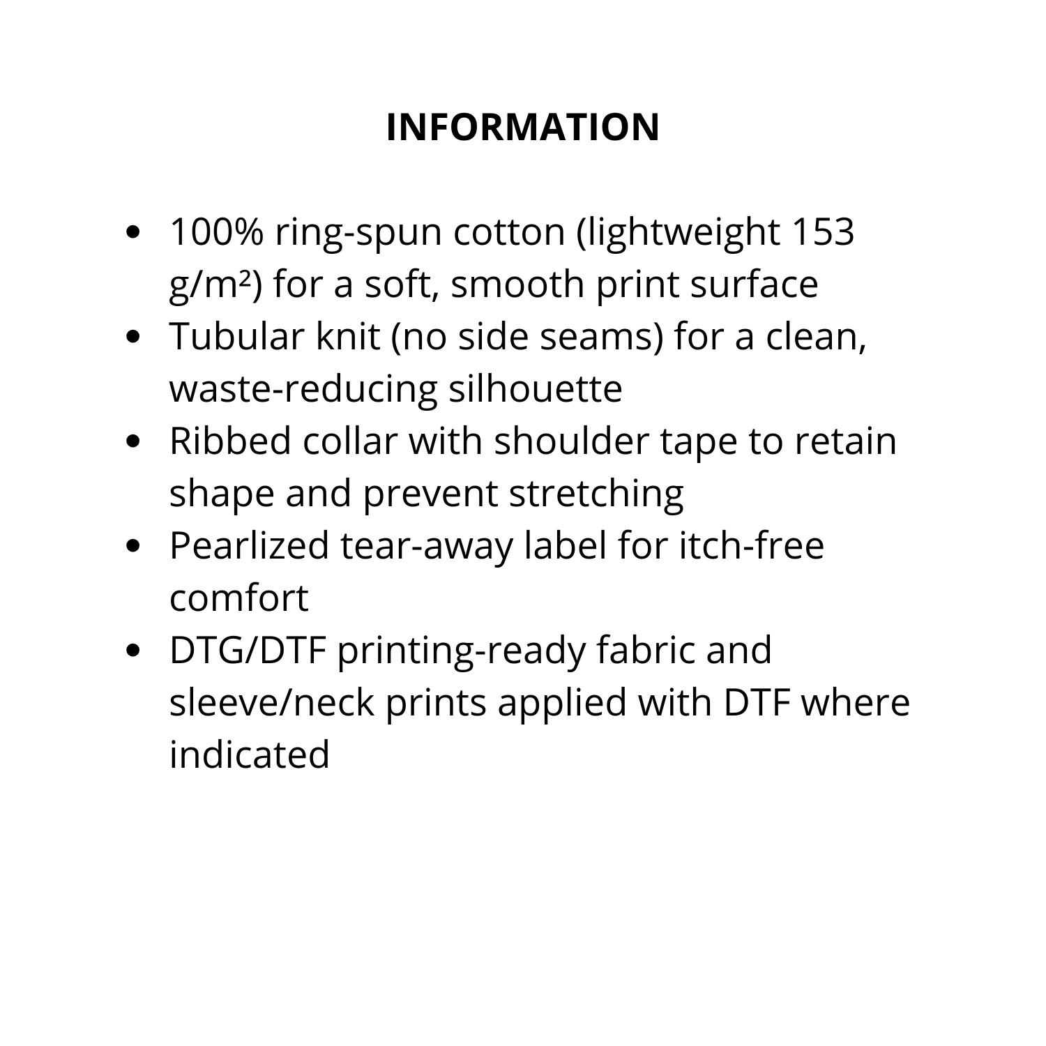 - 100% ring-spun cotton (lightweight 153 g/m²) for a soft, smooth print surface