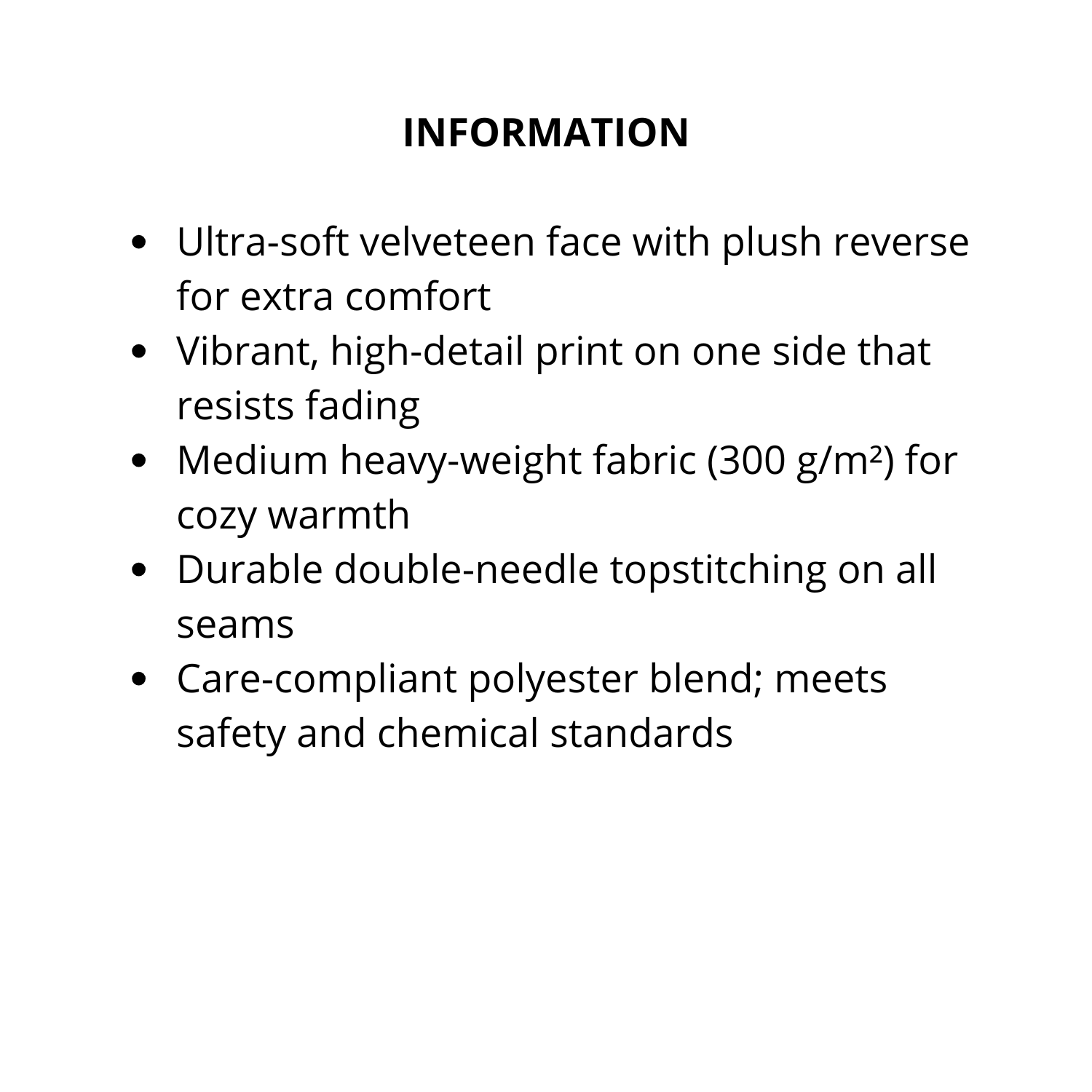 - Sumptuously soft velveteen face with vibrant single-side printing